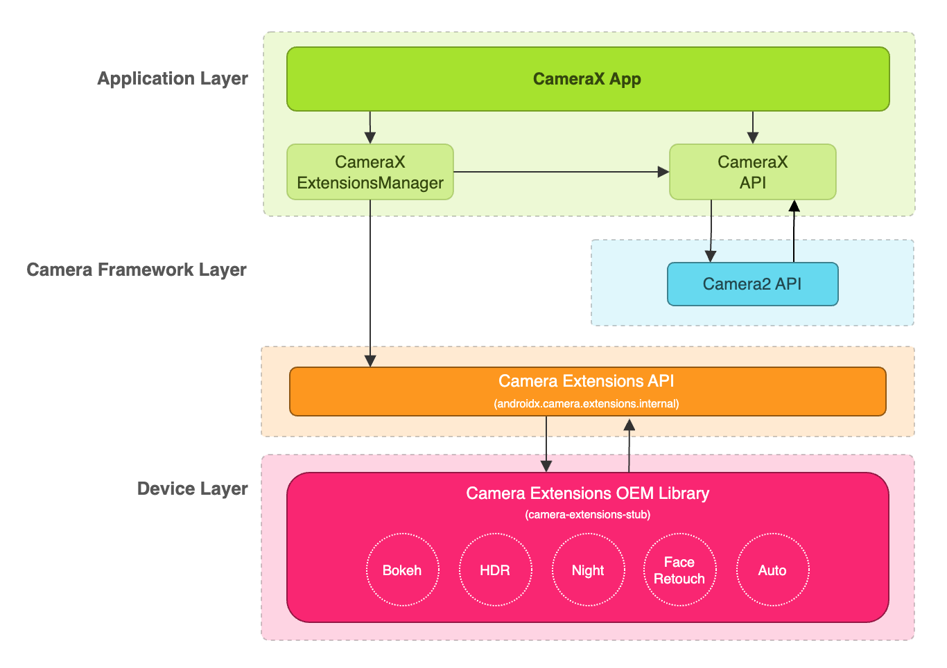 CameraX 应用可以通过 CameraX Extensions API 使用扩展。CameraX Extensions API 可用于管理可用扩展的查询、配置扩展相机会话以及与相机扩展 OEM 库的通信。这样,您的应用就可以使用夜间、HDR、自动、焦外成像或脸部照片修复等功能。