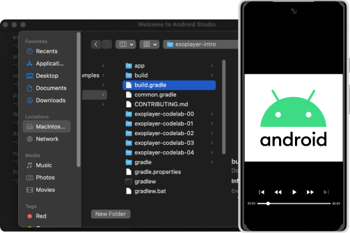 En este instructivo, crearás una instancia de ExoPlayer, la integrarás al ciclo de vida de la actividad de una app, crearás una lista de reproducción, reproducirás transmisiones de video por Internet adaptables, supervisarás el estado de reproducción y personalizarás los componentes de la IU de ExoPlayer.