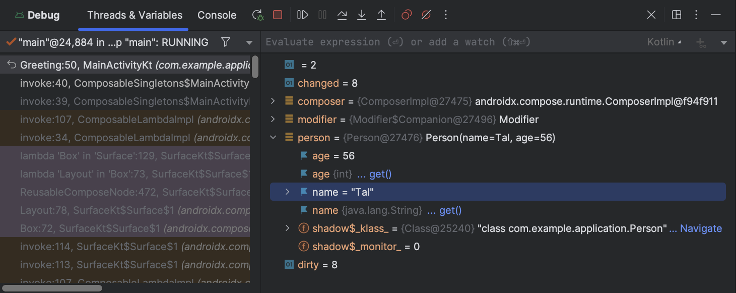 - Un punto de interrupción de método pausa la ejecución de tu app cuando ingresa en un método específico o sale de él. Mientras la app está detenida, puedes examinar variables, evaluar expresiones y, luego, continuar la ejecución línea por línea para determinar las causas de los errores en el tiempo de ejecución. Cuando estableces un punto de interrupción en una función de componibilidad, el depurador enumera los parámetros del elemento componible y su estado para ayudarte a identificar los cambios que podrían haber causado la recomposición.