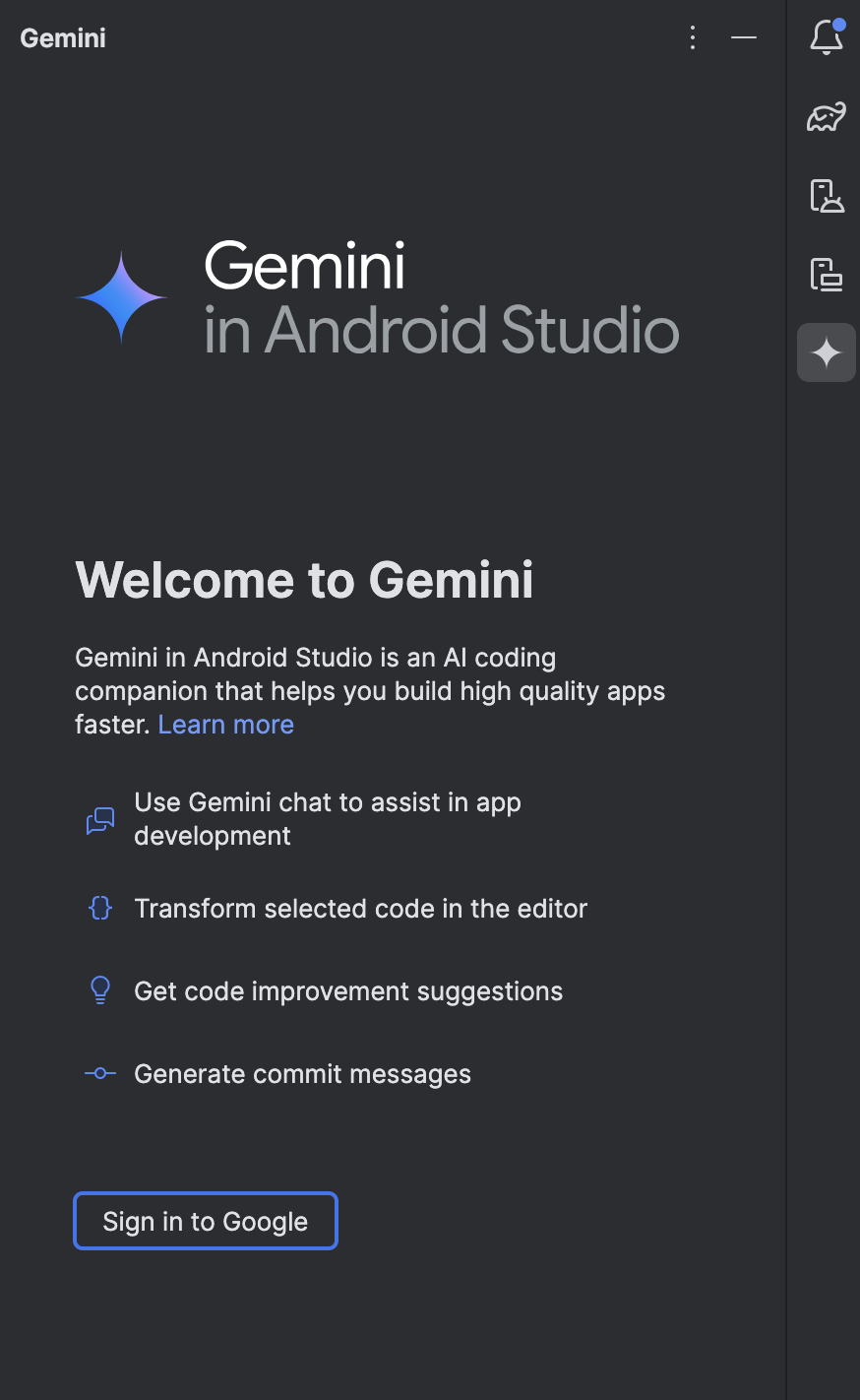 After completing these steps, the chat box appears and you can start using Gemini. At any time, you can quickly check whether Gemini is enabled by checking the Gemini icon at the bottom of the Studio IDE: