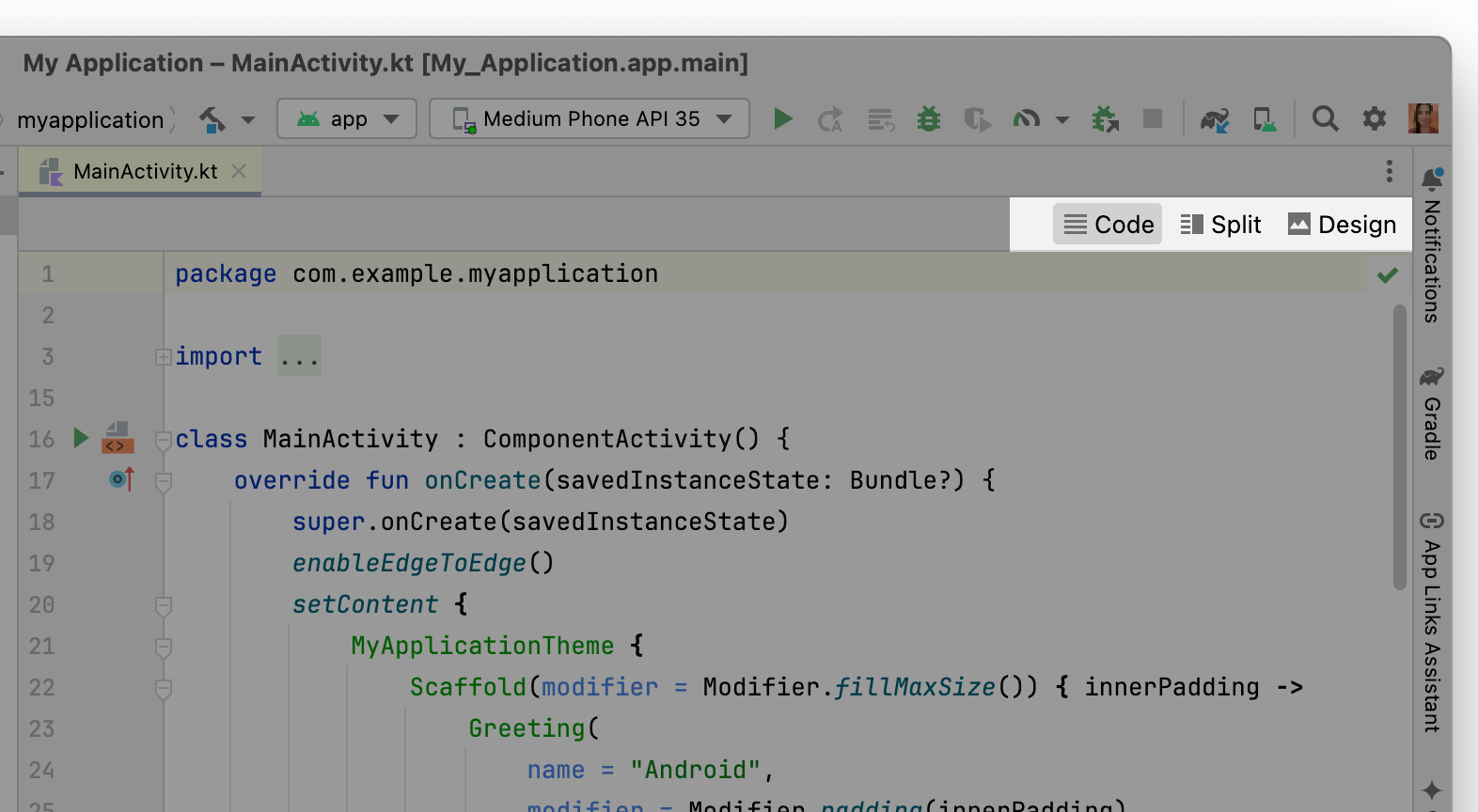 适用于 Compose 和基于视图的预览的界面工具控件(Code/Split/Design)现在位于编辑器标签页之外,更易于访问。