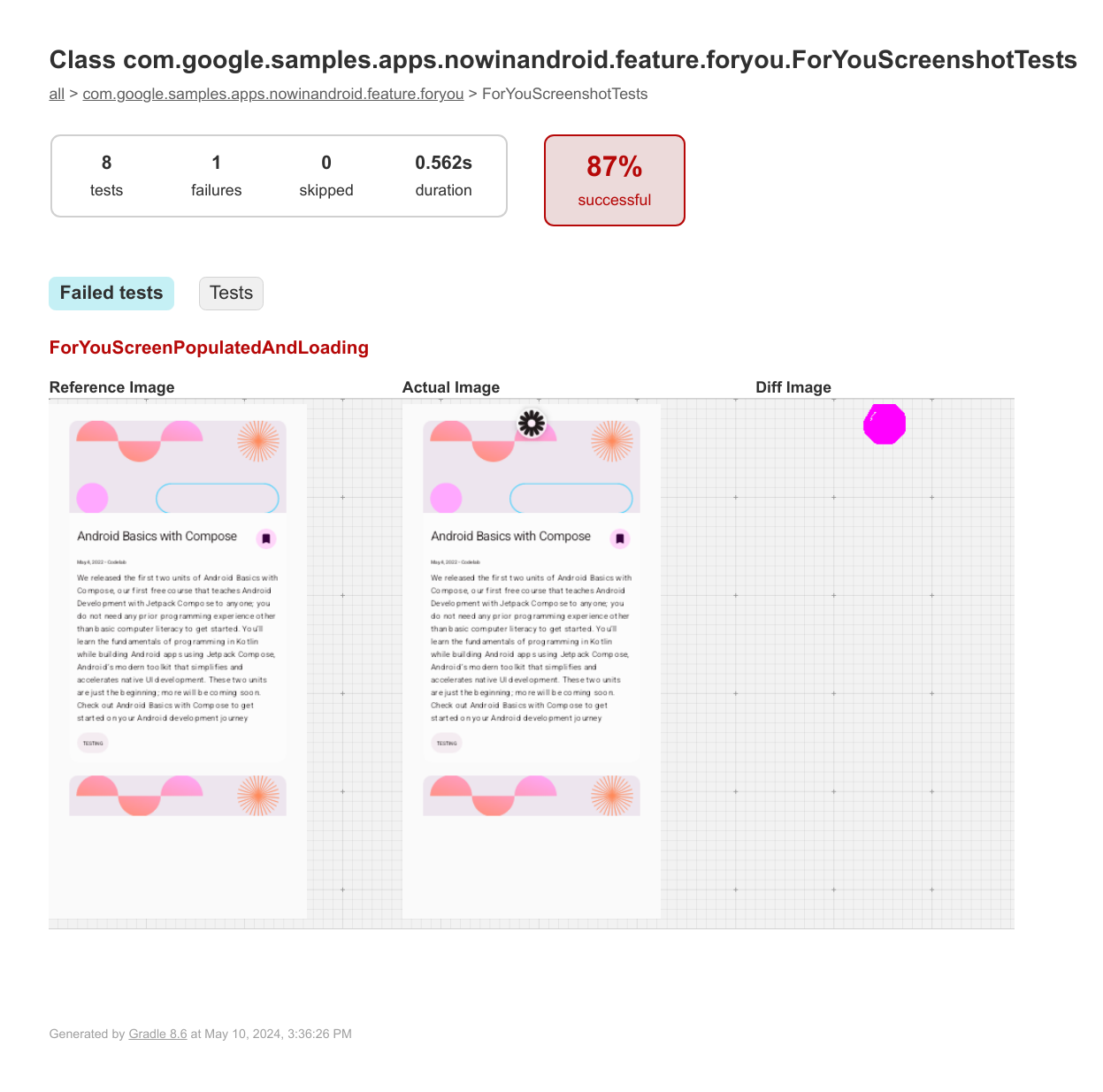 Setelah gambar referensi ada, buat laporan pengujian dengan mengikuti petunjuk di bawah untuk integrasi IDE atau untuk tugas Gradle.