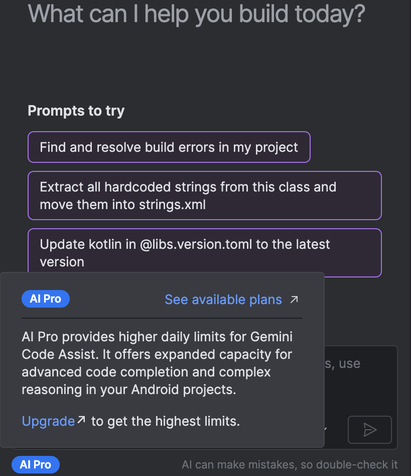 Android Studio Panda 4 Canary 2 introduce l'accesso a un'esperienza migliorata della modalità Agent quando ti abboni ai piani Google One AI Pro o Ultra. L'integrazione di Google One potenzia lo sviluppo Android con limiti di frequenza più elevati e una finestra contestuale espansa per il modello Gemini predefinito. Se hai un abbonamento a un piano Google One AI Pro o Ultra, puoi usufruire automaticamente di questi vantaggi quando accedi al tuo Account Google in Android Studio.
