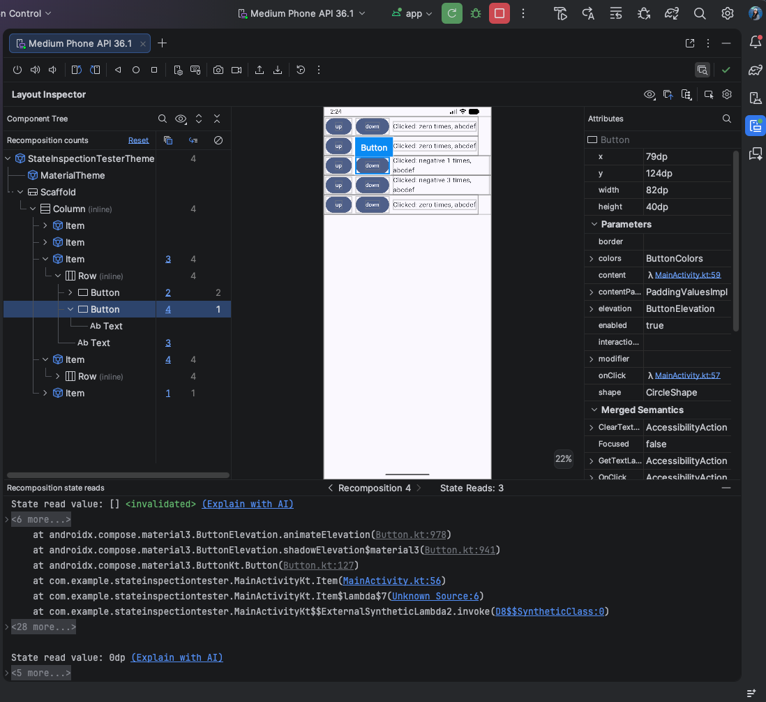 Turn on recomposition state reads in the Layout Inspector Interact with your app. When recompositions occur, click the blue count links in the Component Tree to inspect the state.