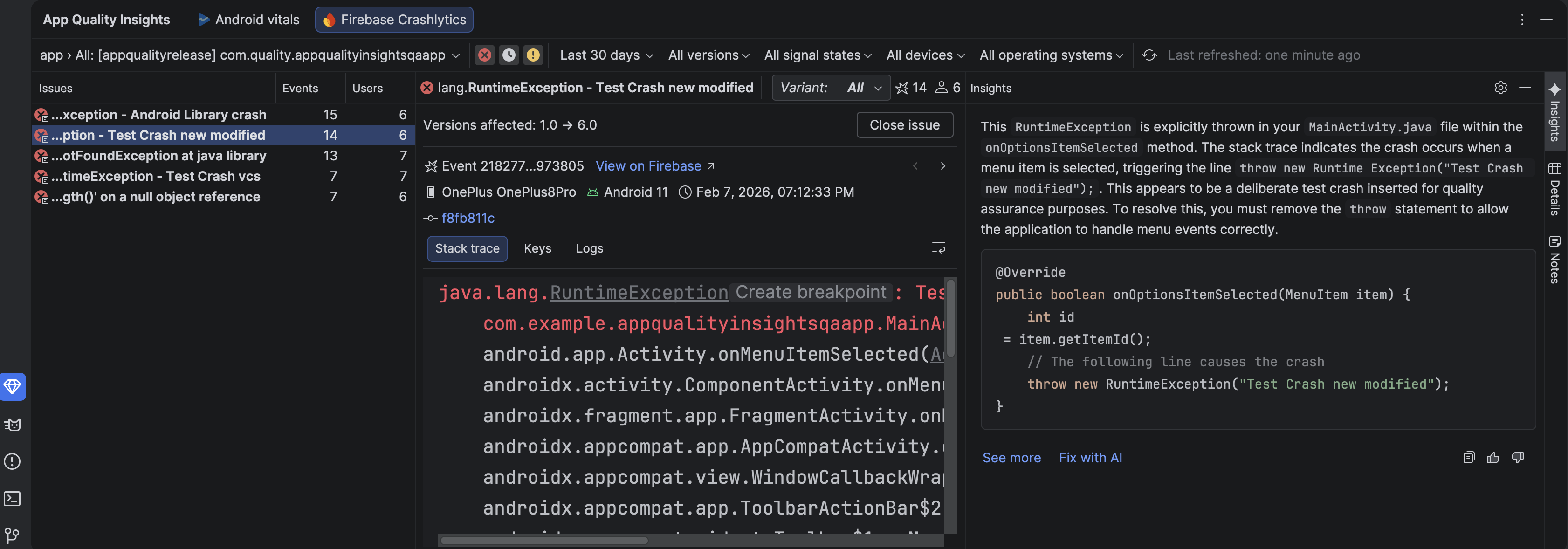 The App Quality Insights tool window is now integrated with the AI agent to analyze crash data along with your source code to provide detailed explanations and suggest potential fixes. After selecting a crash in the App Quality Insights tool window, navigate to the Insights tab and click See more to see a detailed explanation of the crash. Click Fix with AI to have the agent suggest code changes that you can review and accept.