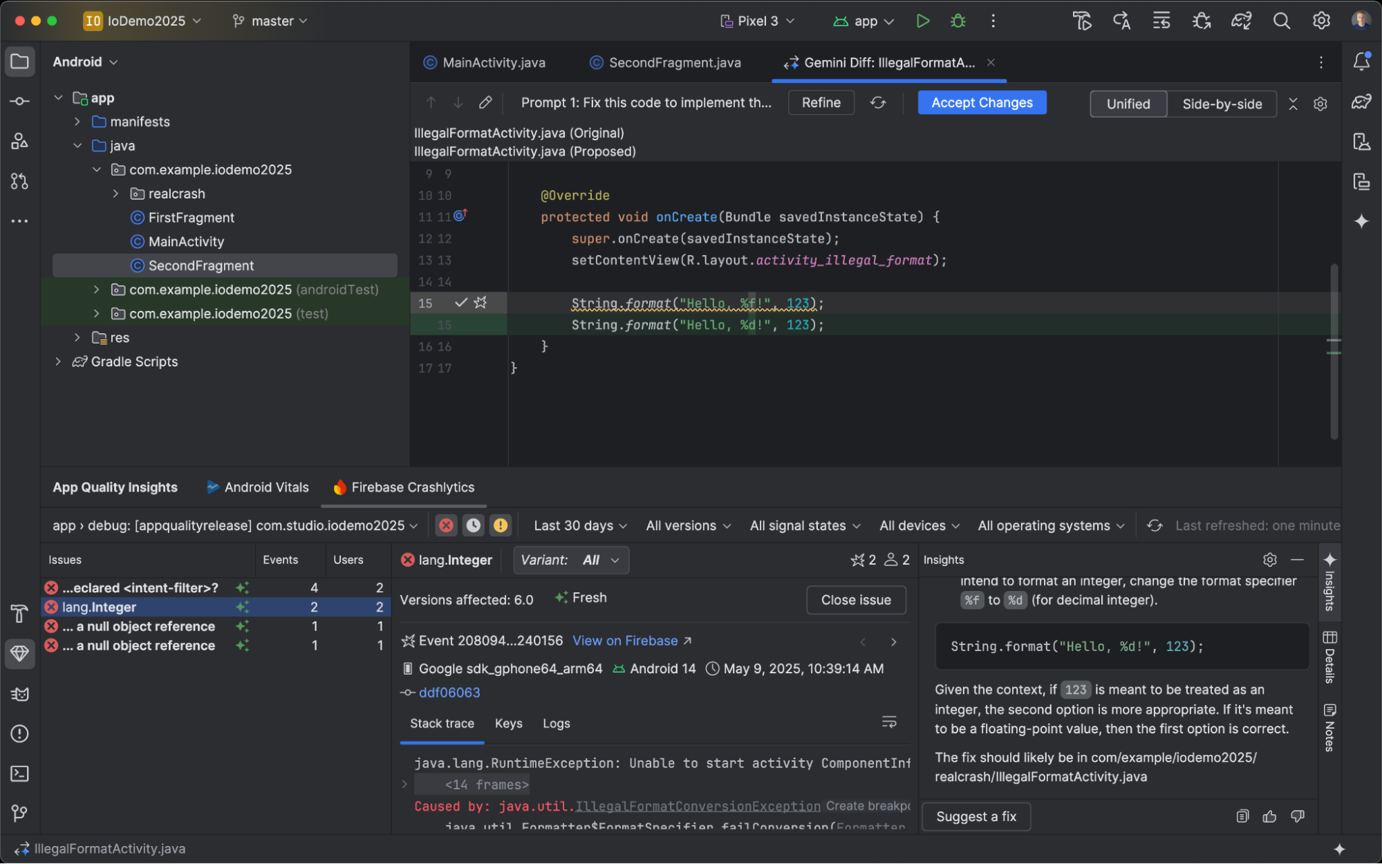 在 Android Studio Meerkat 功能更新中,我们针对 App Quality Insights 工具窗口中报告的崩溃推出了 Gemini 洞见。现在,Android Studio 可以使用 Gemini 分析崩溃数据和您的源代码,以建议潜在的修复方案。在“App Quality Insights”工具窗口中选择一个崩溃问题后,前往数据分析标签页,然后在 Gemini 为该崩溃问题生成数据分析后,点击建议修复。然后,Gemini 会生成建议的代码更改,您可以在编辑器差异标签页中查看并接受这些更改。