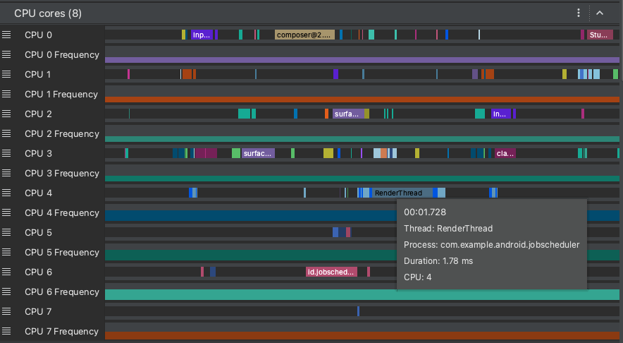 هسته های CPU : فعالیت هر هسته در دستگاه شما را نشان می دهد. مشاهده فعالیت بر اساس هسته ممکن است به شما ایده دهد که کدام یک از آنها هسته های "بزرگ" یا "کوچک" در پردازنده های مدرن موبایل هستند. اشاره گر را روی یک فعالیت رشته نگه دارید تا ببینید این هسته در آن زمان خاص روی کدام رشته در حال اجرا است.