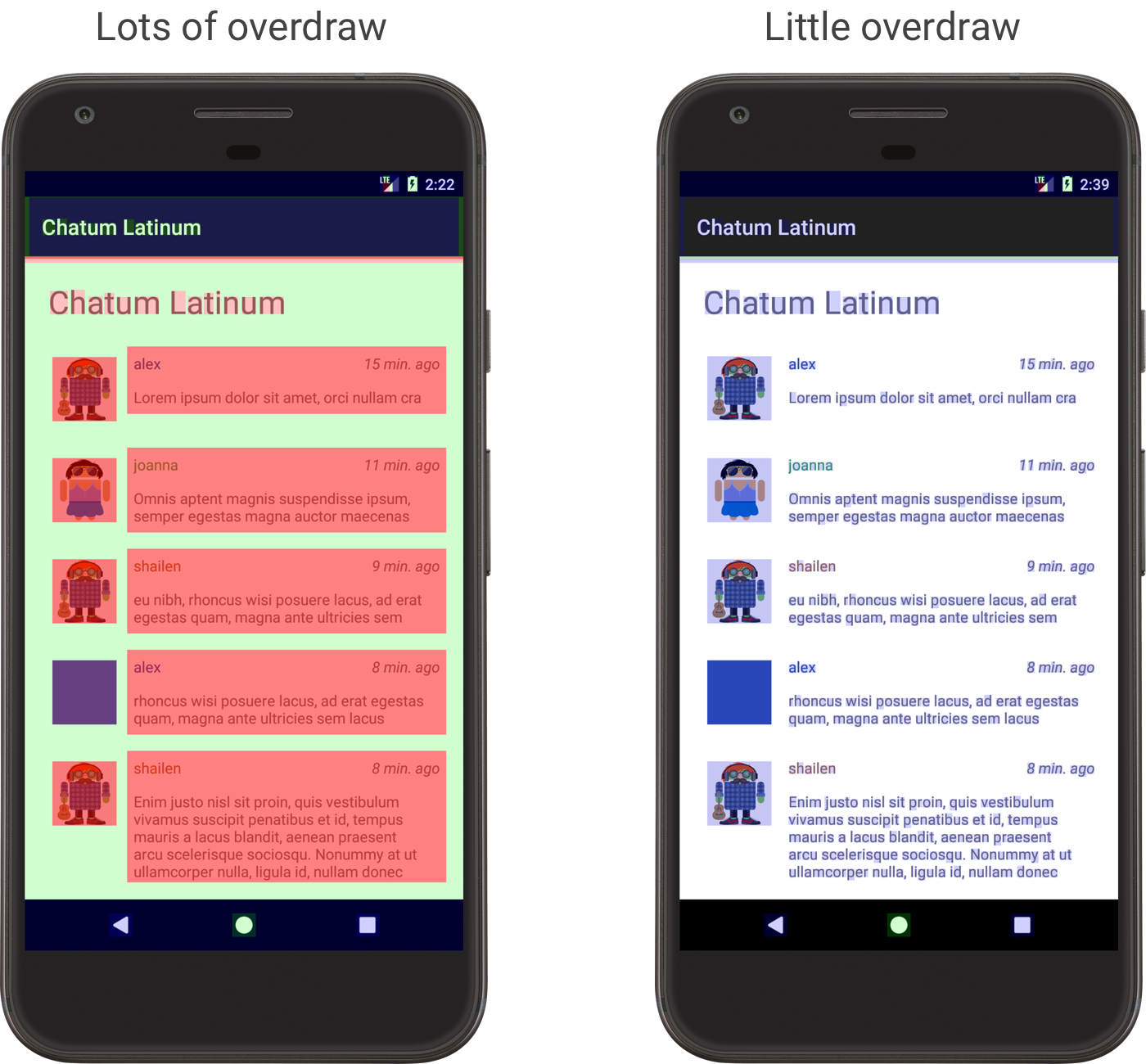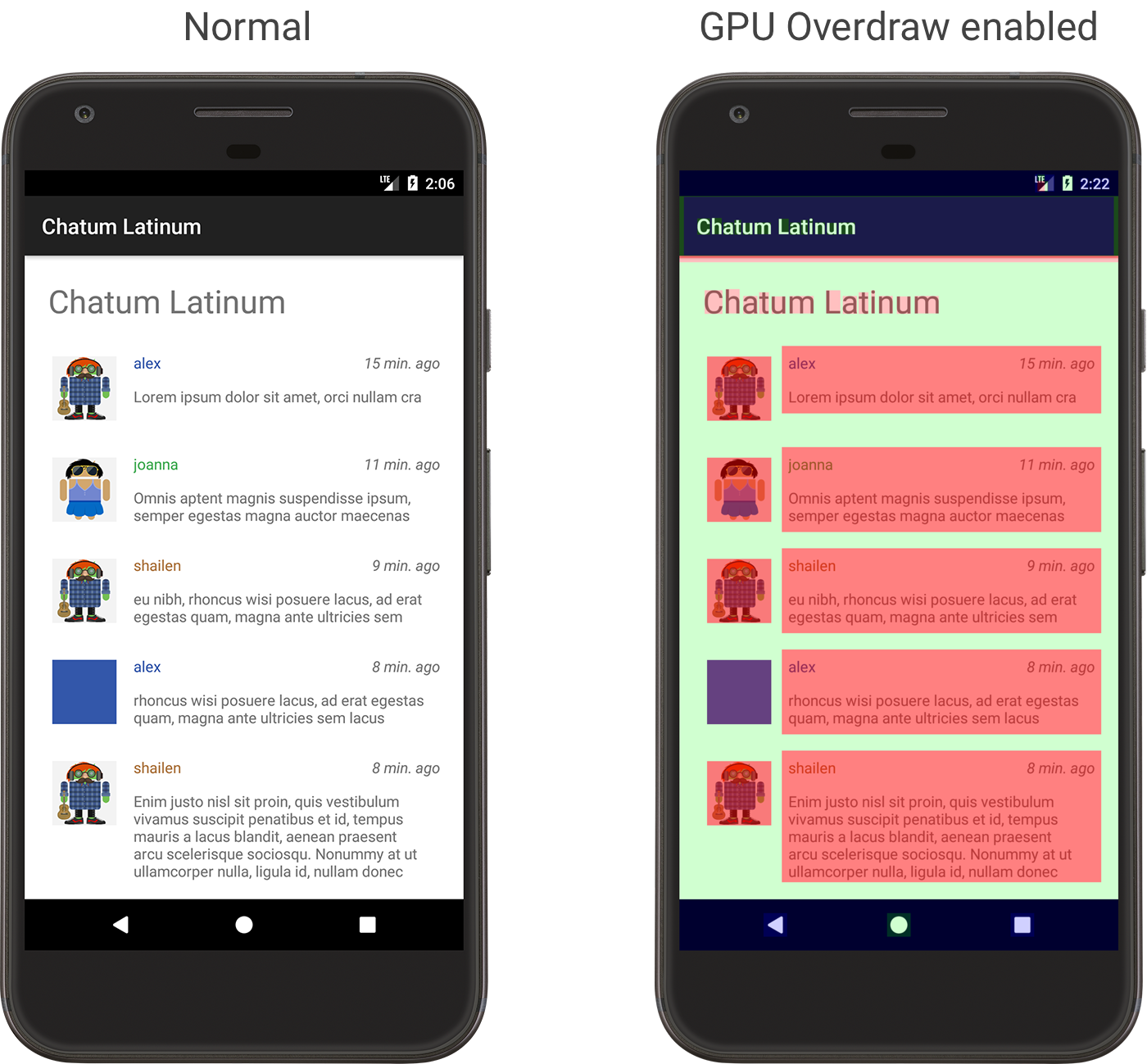 یکی دیگر از ویژگیهای موجود در گزینههای توسعهدهنده به شما کمک میکند تا با کدگذاری رنگی رابط کاربری خود، اضافه برداشت را شناسایی کنید. Overdraw زمانی رخ می دهد که برنامه شما یک پیکسل را بیش از یک بار در یک قاب ترسیم کند. بنابراین این تجسم نشان می دهد که برنامه شما ممکن است بیشتر از آنچه لازم است کار رندرینگ انجام دهد، که به دلیل تلاش اضافی GPU برای رندر پیکسل هایی که برای کاربر قابل مشاهده نیستند، می تواند یک مشکل عملکرد باشد. بنابراین، باید در صورت امکان ، رویدادهای اضافه برداشت را برطرف کنید .