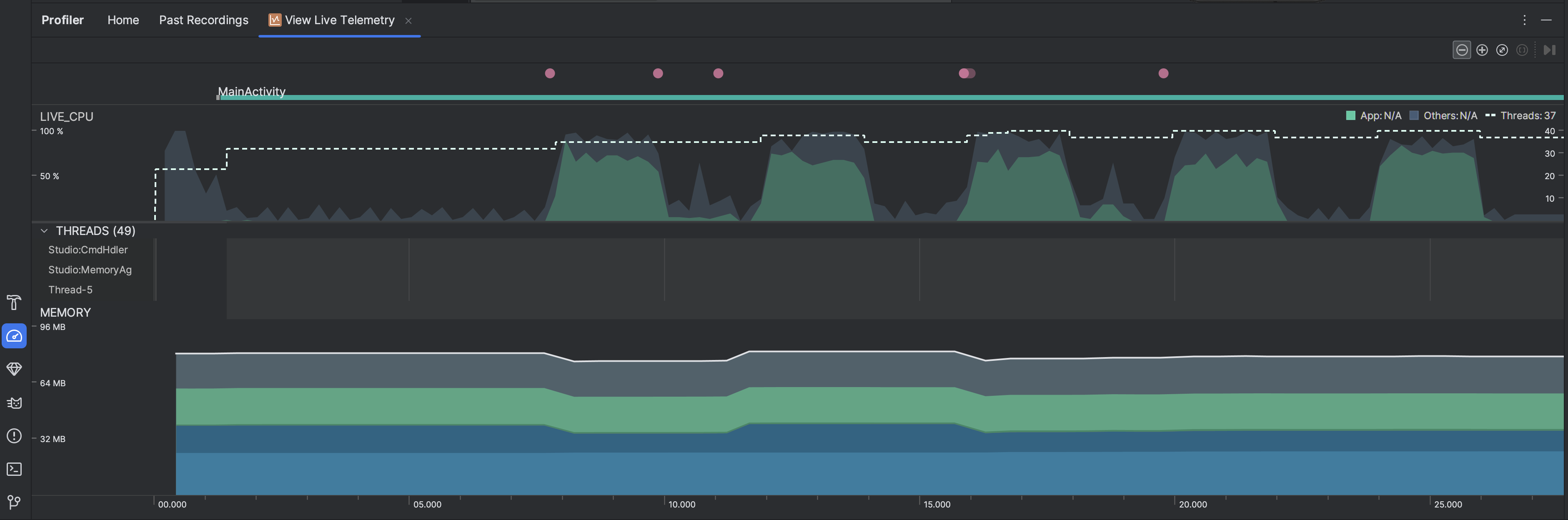 通过实时检查应用,您可以大致了解设备的 CPU 使用情况、线程活动和内存使用情况。如果您不知道从何处着手分析应用,请使用实时视图进行探索性分析,然后在发现可优化的行为时,通过特定的分析任务深入了解。