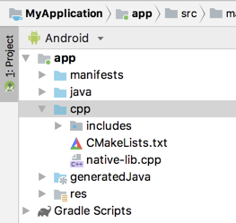 Android 스튜디오에서 새 프로젝트가 만들어지면 IDE 왼쪽에서 Project 창을 열고 메뉴에서 Android 뷰를 선택합니다. 그림 1과 같이 Android 스튜디오는 cpp 그룹을 추가합니다.