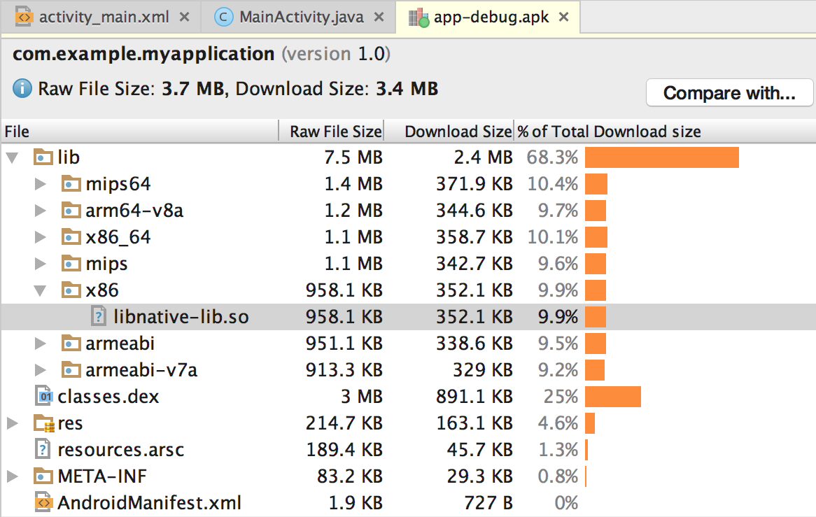 Gradle이 네이티브 라이브러리를 앱에 패키징하는지 확인하려면 다음과 같이 APK Analyzer를 사용하세요.