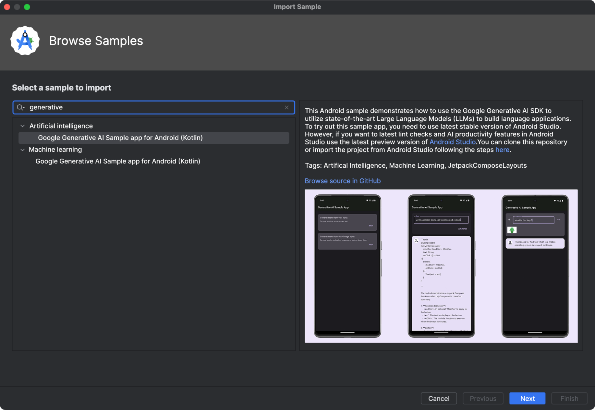 如需详细了解适用于 Android 的 Google AI SDK,请查看适用于 Android 的 Google AI SDK 快速入门指南。如需获取更多代码示例,您可以通过依次选择 File > New > Import Sample,然后在搜索框中输入 Generative AI Sample,将生成式 AI 代码示例导入 Android Studio。