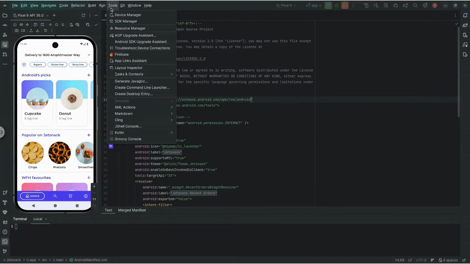 Android Studio 中的 AI 代理现在可以使用各种工具将应用部署到已连接的设备、检查当前屏幕上显示的内容、拍摄屏幕截图、检查 Logcat 中的错误,以及通过 adb shell input 与正在运行的应用互动。这样,代理就可以帮助您进行涉及重新运行应用、检查错误以及验证特定更新是否成功完成(例如,通过拍摄和查看屏幕截图)的更改或修复。