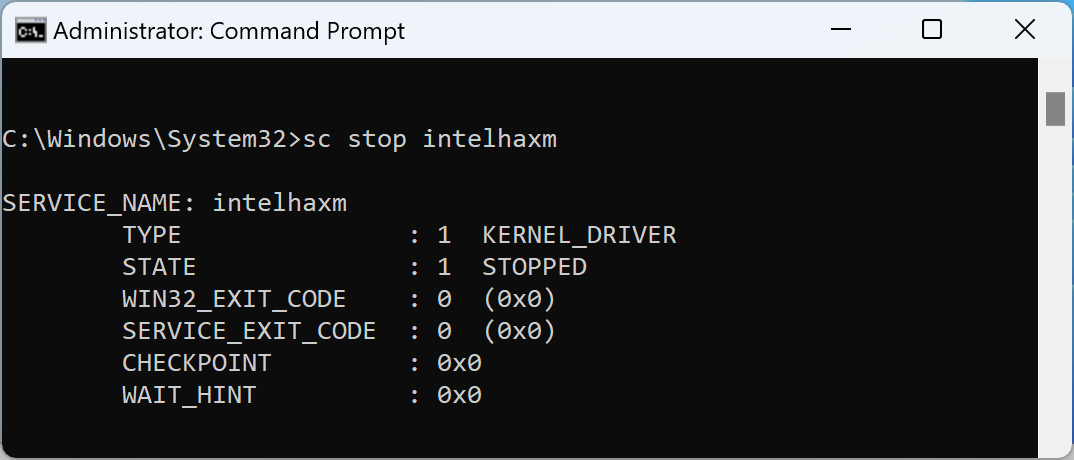 1. 运行“sc stop intelhaxm”停止 Intel HAXM 服务。您应该会看到以下输出内容。