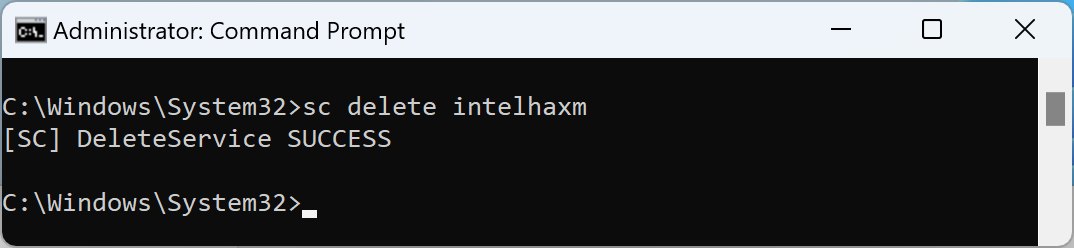 2. 运行“sc delete intelhaxm”以删除 Intel HAXM 服务。您应该会看到以下输出内容。
