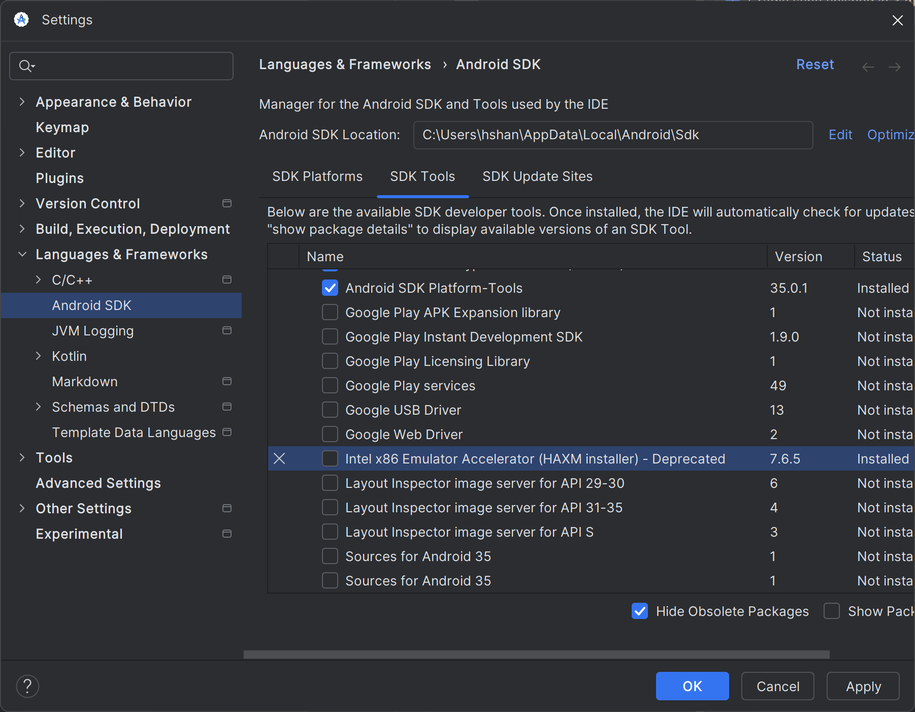 使用 Android Studio 中的 SDK 管理器卸载 Intel HAXM