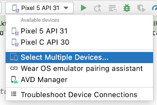 インストルメンテーション テストは、デフォルトでは 1 台の物理デバイスまたはエミュレータで実行されます。2 台以上のデバイスでテストがどのように動作するかを確認するには、次の手順で追加のデバイスを選択します。
