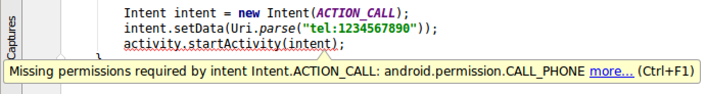 当您使用间接权限时,构建工具会执行数据流分析,以检查传递给方法的参数是否具有任何 @RequiresPermission 注解。随后,它们会对方法本身强制执行参数的所有现有注解。在 startActivity(Intent) 示例中,如果向 startActivity(Intent) 方法传递了不具备相应权限的 intent,Intent 类中的注解就会导致针对无效使用该方法的情况生成警告,如图 1 所示。