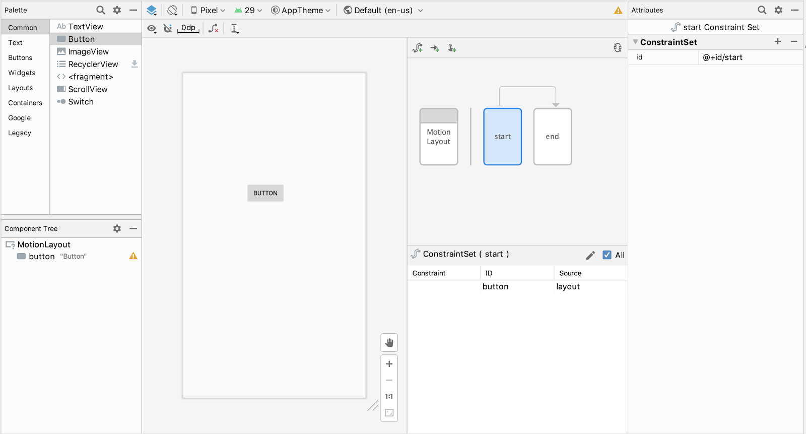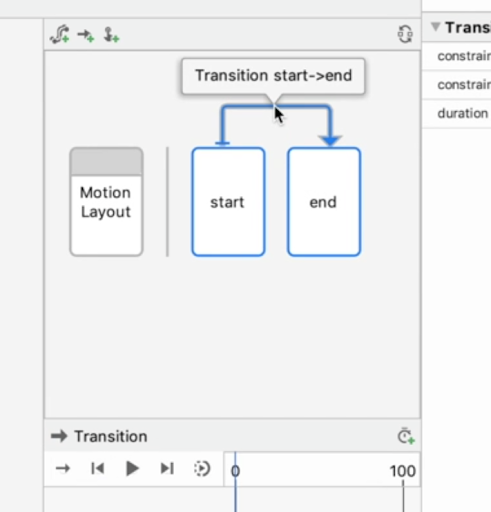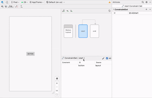 随后成为您的根布局,并且它会出现在 Motion Editor 界面中。布局已包含开始 ConstraintSet
