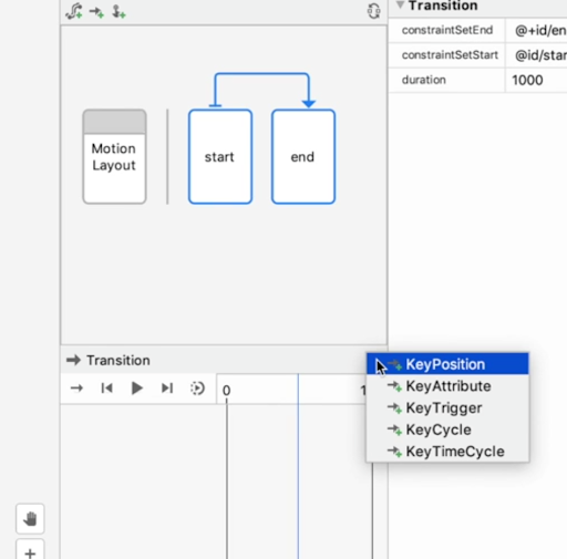 然后,在 Transition 时间轴窗格中,点击右上角并选择 KeyPosition: