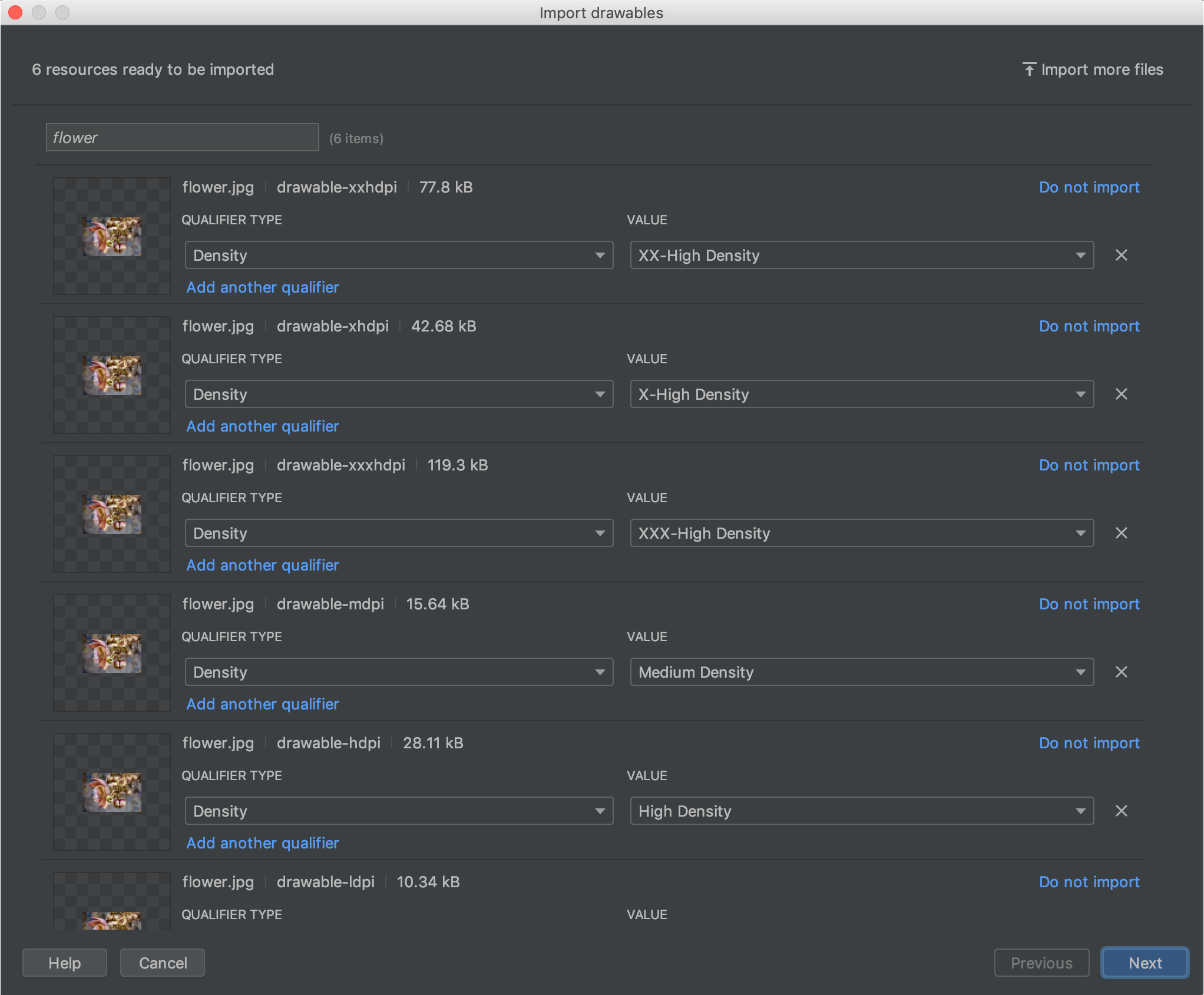 例如,如果您要为同一资源提供适用于不同屏幕密度的多个版本,则可以为每个版本添加一个 Density 限定符。请注意,如果两项或多项资源具有相同的名称和限定符,则仅导入一个版本。