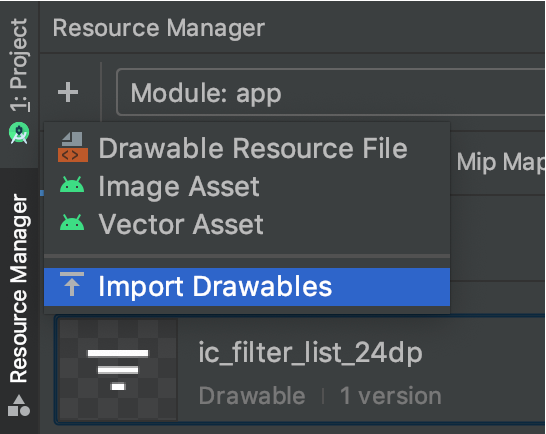 除了上述功能之外,Resource Manager 还提供了一种将可绘制对象批量导入项目中的方法。若要批量导入,您可以采用以下任一方法: