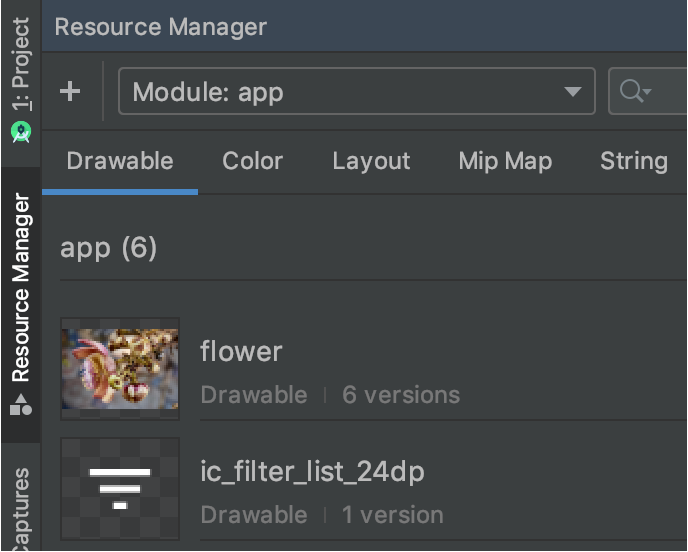 Resource Manager یک پنجره ابزار برای وارد کردن، ایجاد، مدیریت و استفاده از منابع در برنامه شما است. برای باز کردن پنجره ابزار، View > Tool Windows > Resource Manager را از منو انتخاب کنید یا Resource Manager را در نوار سمت چپ انتخاب کنید.