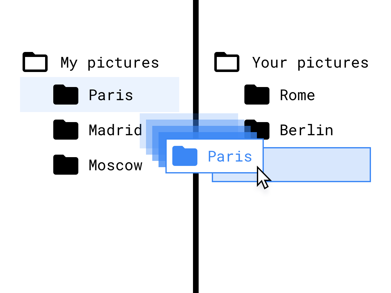 নিচের চিত্রের মত ড্র্যাগ এবং ড্রপ ইন্টারঅ্যাকশন তৈরি করা আপনার অ্যাপে দক্ষ, স্বজ্ঞাত উত্পাদনশীলতা কার্যকারিতা আনতে পারে। আরও তথ্যের জন্য, টেনে আনুন এবং ড্রপ দেখুন।