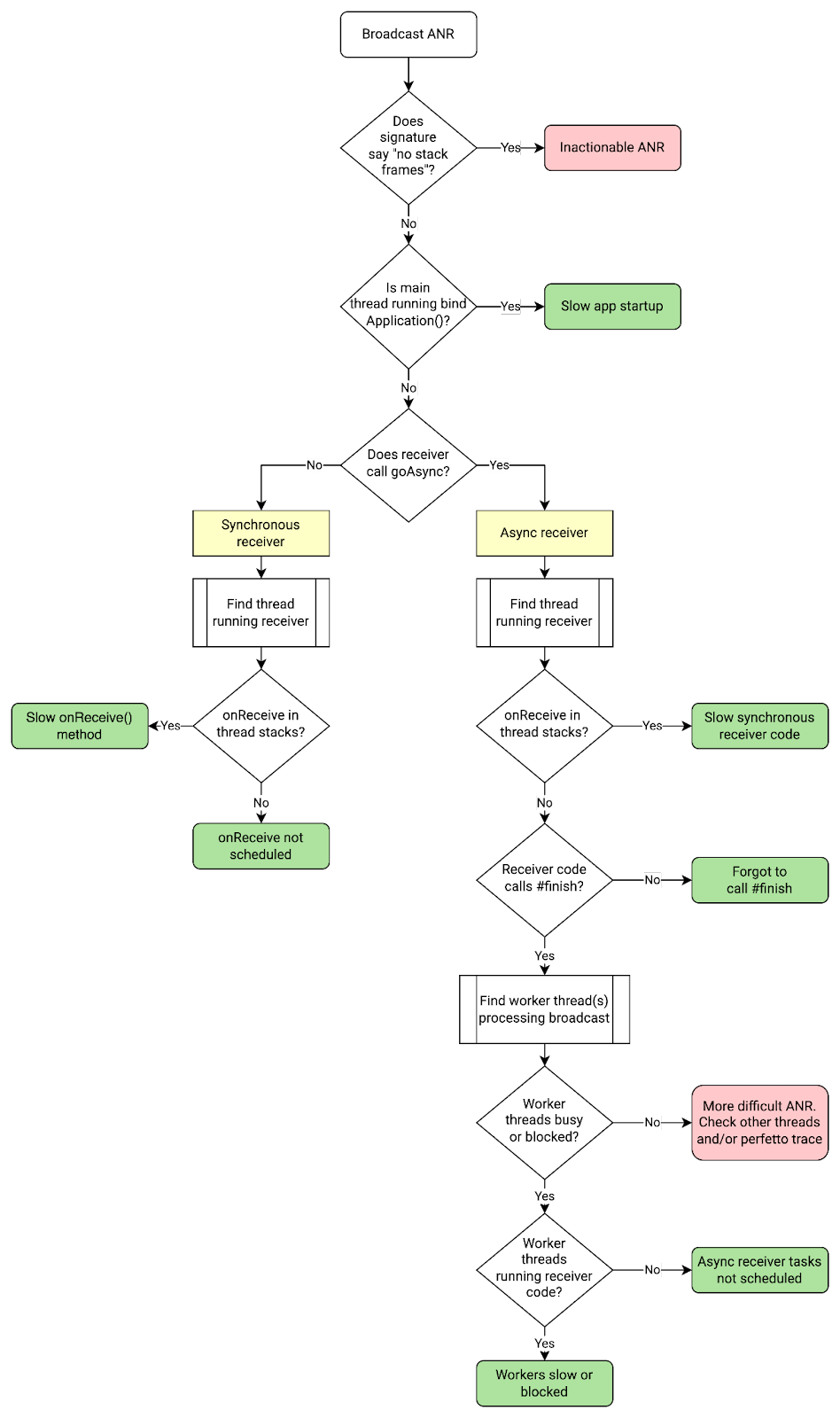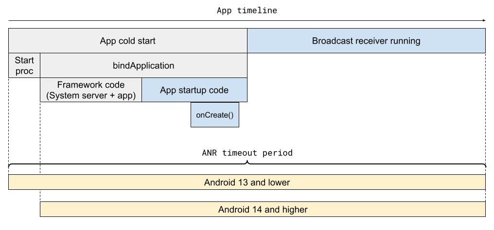 به برنامه ارسال می شود، و زمانی که برنامه پردازش پخش را به پایان می رساند، پایان می یابد. اگر فرآیند برنامه قبلاً در حال اجرا نبوده است، باید یک شروع سرد در دوره وقفه ANR نیز انجام دهد. از این رو، راه اندازی کند برنامه می تواند منجر به ANR گیرنده پخش شود.
