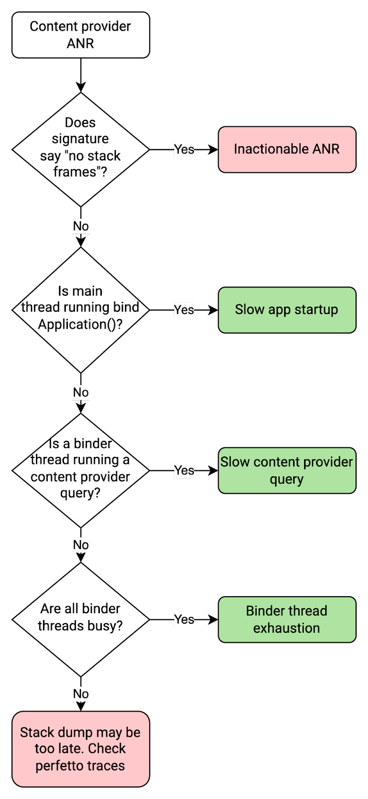 برای اشکالزدایی ANR ارائهدهنده محتوا با استفاده از امضای خوشهای و گزارش ANR در Google Play Console یا Firebase Crashlytics، به آنچه که رشته اصلی و رشته(های) کلاسور انجام میدهند نگاه کنید.