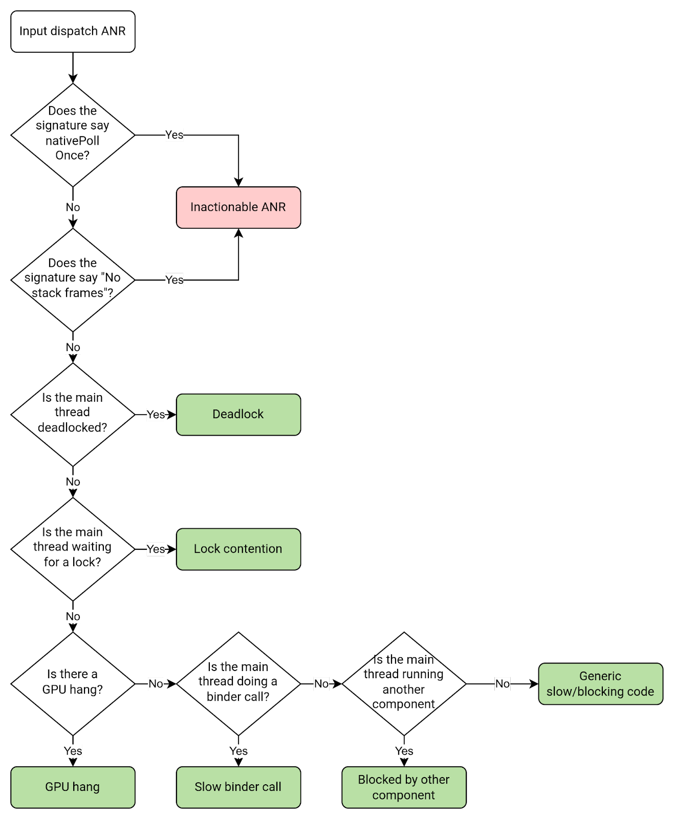 GPU قطع است | GPU hang یک مشکل سیستمی یا سخت افزاری است که باعث مسدود شدن رندر و در نتیجه ارسال ANR ورودی می شود. | متأسفانه، معمولاً هیچ اصلاحی در سمت برنامه وجود ندارد. در صورت امکان برای عیب یابی با تیم سخت افزار تماس بگیرید. |
