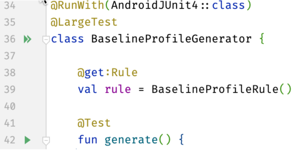 public class BaselineProfileGenerator { @Rule Public BaselineProfileRule baselineRule = new BaselineProfileRule(); @Test Public void startupBaselineProfile() { baselineRule.collect( "com.myapp", (scope -> { scope.startActivityAndWait(); Return Unit.INSTANCE; }) ) } }