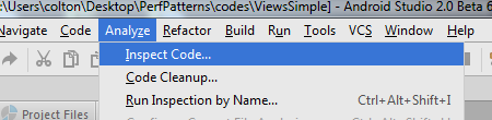 Android Studio の lint ツールを使用すると、ビュー階層の非効率性を認識できます。lint ツールを使用するには、図 1 に示すように、[Analyze] > [Inspect Code] の順に選択します。