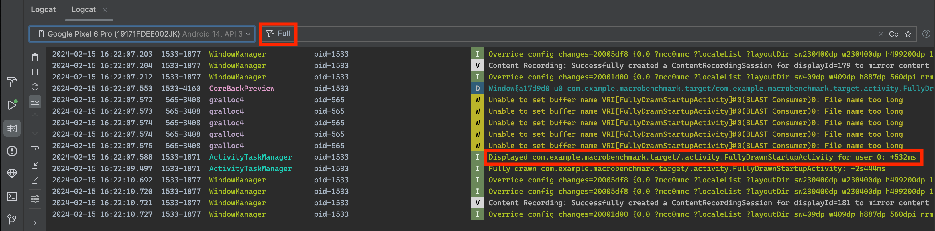 للعثور على TTID، ابحث في أداة سطر الأوامر Logcat عن سطر ناتج يحتوي على قيمة تُسمى Displayed. هذه القيمة هي TTID وتشبه