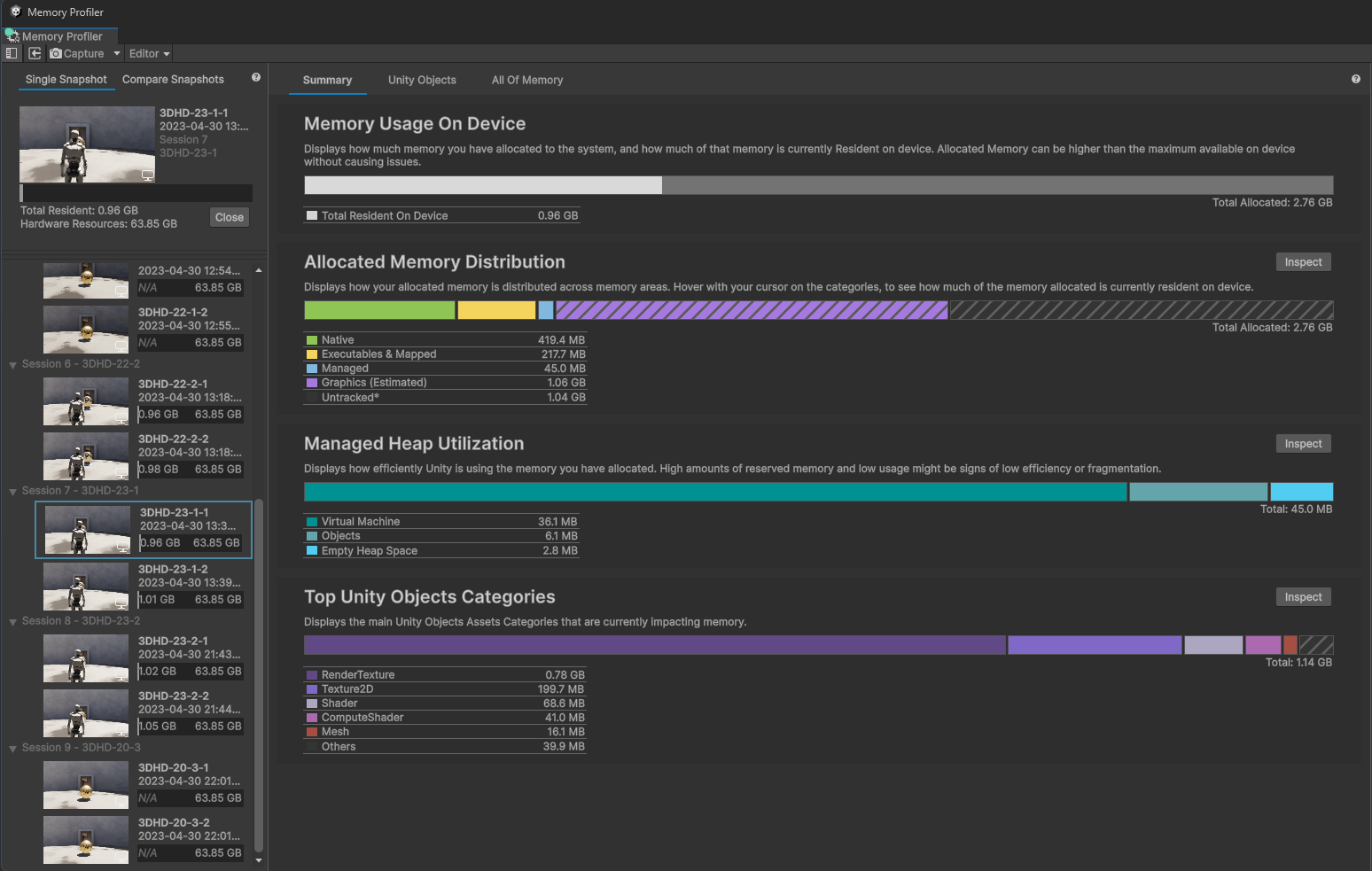Se utilizzi Unity Engine per creare le tue app, puoi seguire le linee guida per il profiling della memoria di Unity. Unity offre due strumenti per analizzare l'utilizzo della memoria nella tua applicazione.