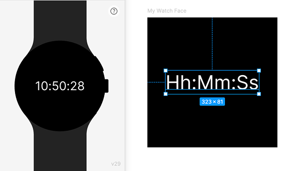 在表盘设计器窗口中,将文字的行为从“静态”更改为“数字时间”。预览显示了在真实设备上的效果:
