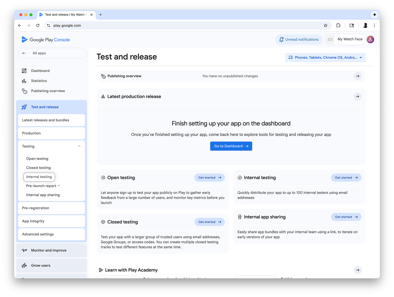 Volte ao menu de teste interno e crie uma faixa de teste interno somente para Wear OS. Em seguida, crie um lançamento: