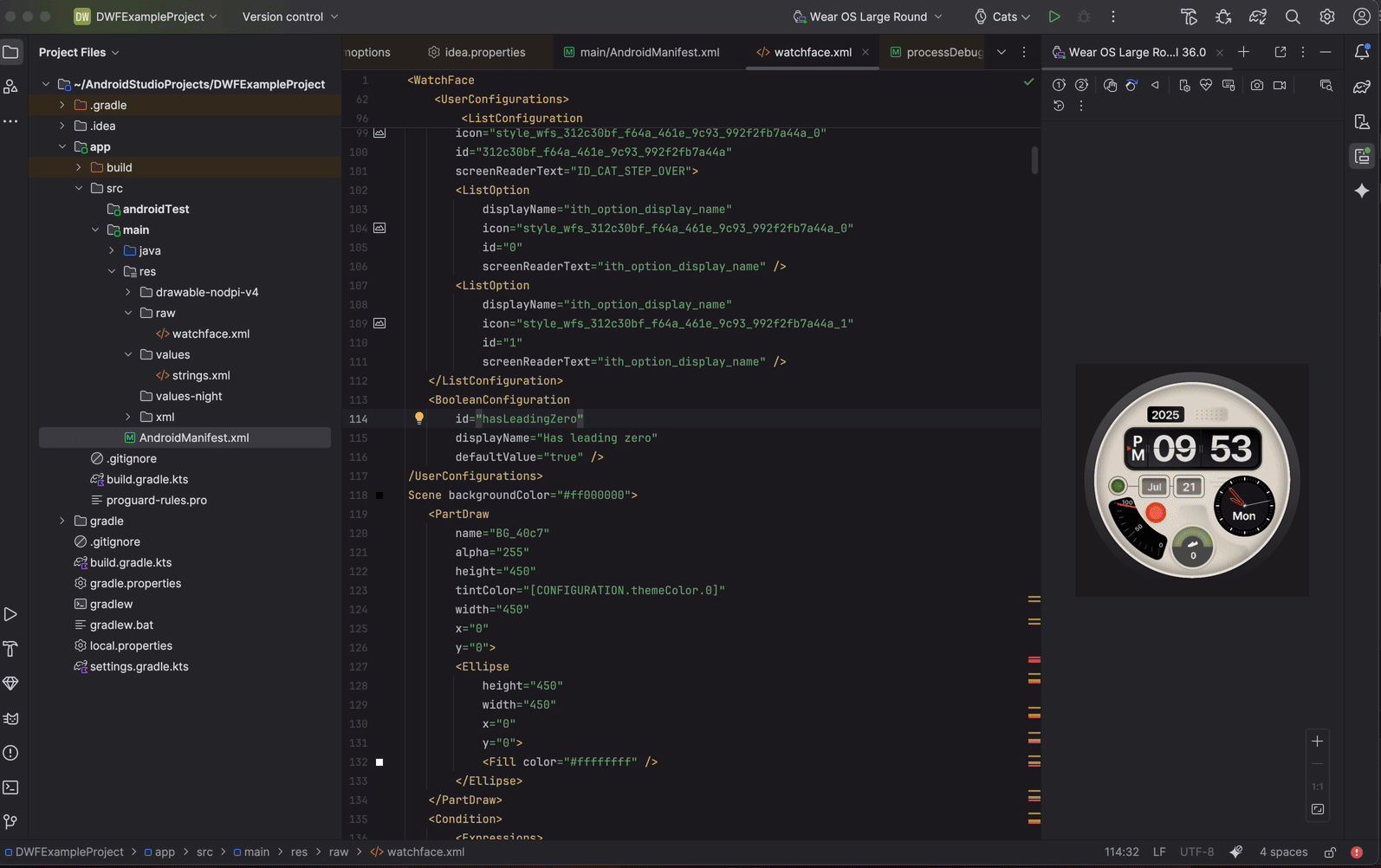 অ্যান্ড্রয়েড স্টুডিও আপনার XML সংজ্ঞা লিখতে এবং ডিবাগ করতে সাহায্য করার জন্য ওয়াচ ফেস ফর্ম্যাটের জন্য সম্পাদক সমর্থন প্রদান করে।